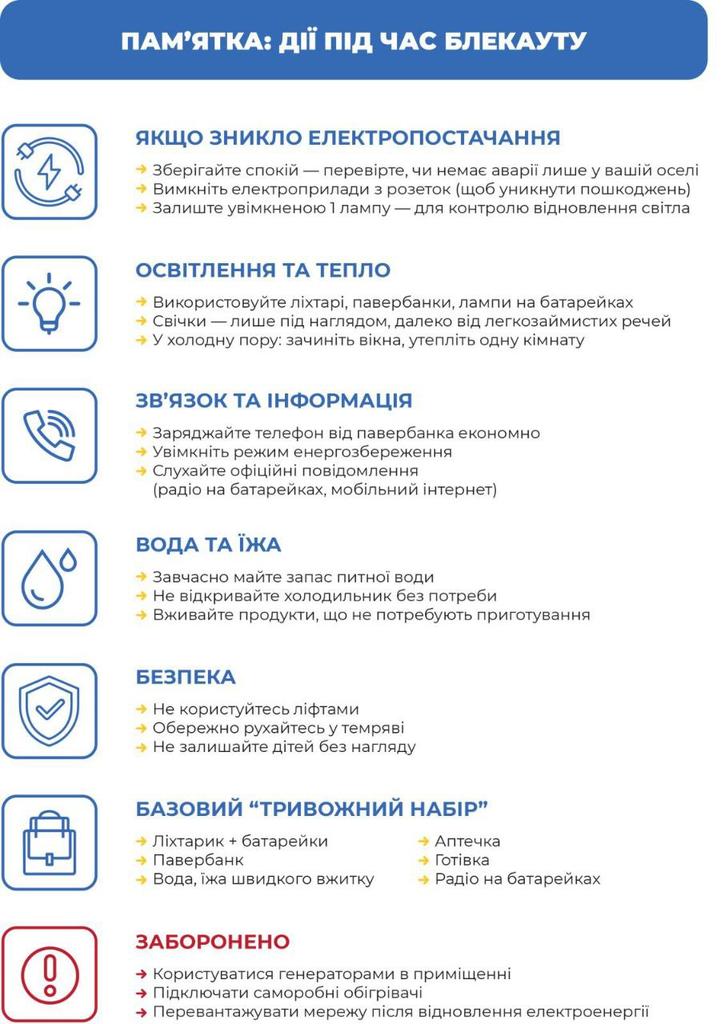 Органи влади всіх рівнів вживають усіх можливих заходів для забезпечення належних умов життєдіяльності у разі настання можливого «BLACKOUT». Проте, багато залежить особисто від Вас, від Вашої підготовки та дій у разі відсутності електро-, тепло-, водопостачання. |