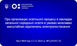 Лист МОН від 17.11.2025 р. №1/24197-25 Про організацію освітнього процесу в закладах загальної середньої освіти в умовах можливих масштабних відключень електропостачання |